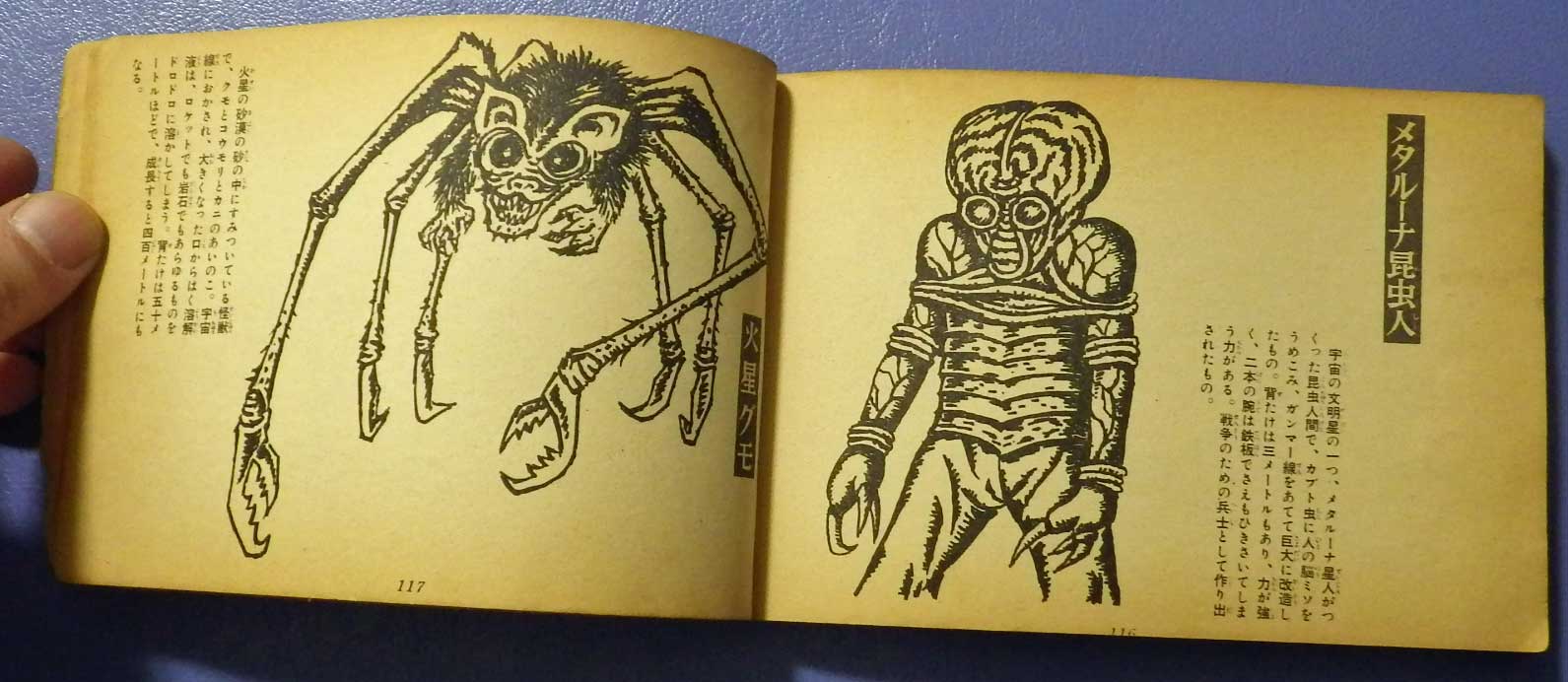 ウルトラマンに出てきた怪獣たちのカラー写真が並びますが、非常に興味深いのは背景が畑だったりトタンの壁だったり、草むらだったりすることです。なんだか製作所で出来上がった怪獣たちをとりあえず外に出して日差しの下で撮影してみた感がありありです。なんだかとっても親近感あり当時はある意味でワクワクしたものでした。現代では絶対撮影されないような風景でほんわかとしてしまいます